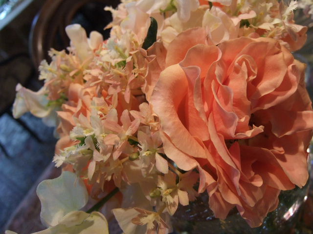 そして、2種共更に茎を短くして、淡いオレンジの低いガラスの花瓶に生けましたら、やっと何とかイメージ通りの素敵なアプリコットブーケが出来上がりました!
