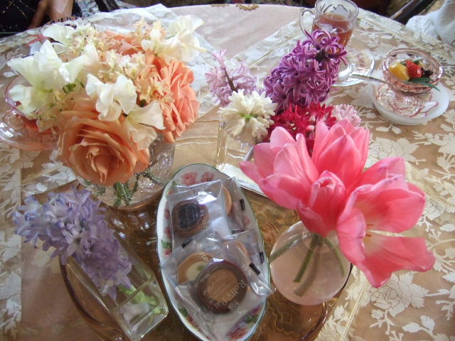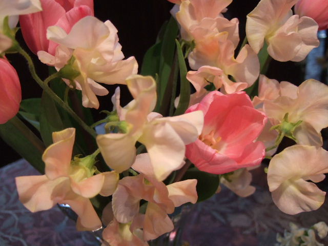 先日友人をお茶にお誘いしたら、ピンクのチューリップとアプリコットのスィトピーの春のブーケをプレゼントしてくれました。