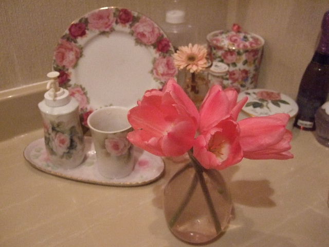 チューリップはとにかく長くまっすぐなので、思い切って葉もなくなるくらい短く切って、ピンクのガラスの器(これは多分トックリです)に花の部分だけ見せるように生けました。