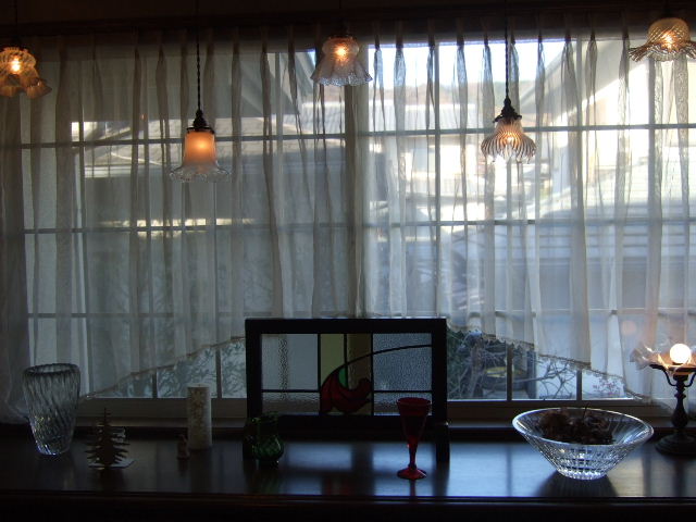 常時飾っている赤い百合のステンドグラスに併せて、そこだけは特別に赤と緑のガラス小物を一つずつ置いて。