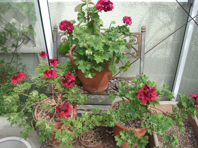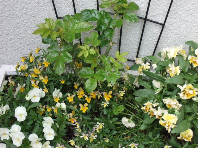 パンジーゼラニウムやアイビーゼラニウム、淡い色のゼラニウムたちも温室から出られてやっと出番が。