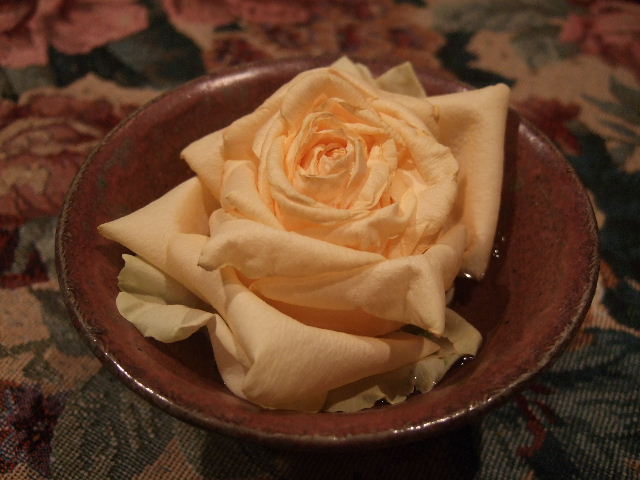 さらに二輪だけ残ったので、デザート用の器、陶器とガラスの中に一輪ずつ浮かべて楽しみました。