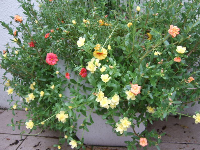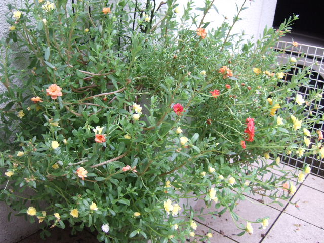 真夏の花の少ない時季に、門扉の薔薇の鉢の足元に何を植えようかと考えて思い浮かんだのが、小さな花の松葉ボタンとポーチュラカ。