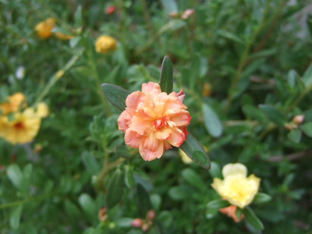 ポーチュラカは、松葉ボタンに合うよう杏色と黄色い八重の花を選びました。
