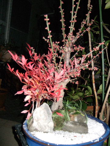 昨年末にお正月の飾りとして、蕾がぎっしり付いた紅梅と紅葉した南天の葉、竜の髭、藪小路が寄せ植えされた盆栽が目に留まりました。