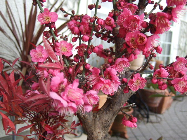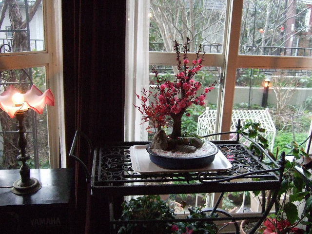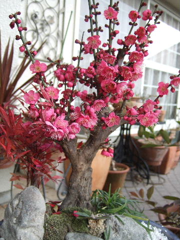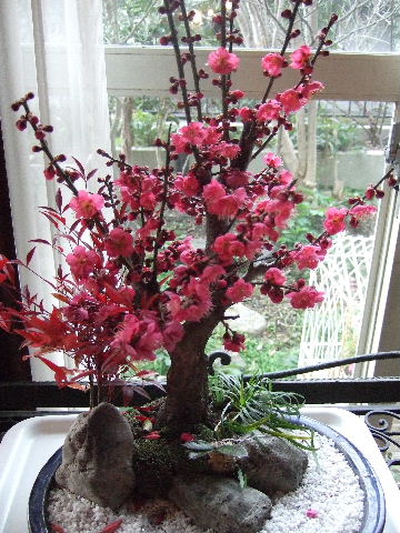含蓄深いこのお話を、この小さな盆栽の紅梅の中に見出し、しばし懐かしく幸せな思いに包まれました。