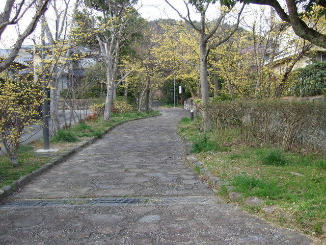 そのお隣の小道はこの時季、黄色いサンシュユが至る所に植え込まれており、石畳は黄色い靄に包まれたような風景に変わり、明るい春の気配が一杯でウキウキしながら歩きます。